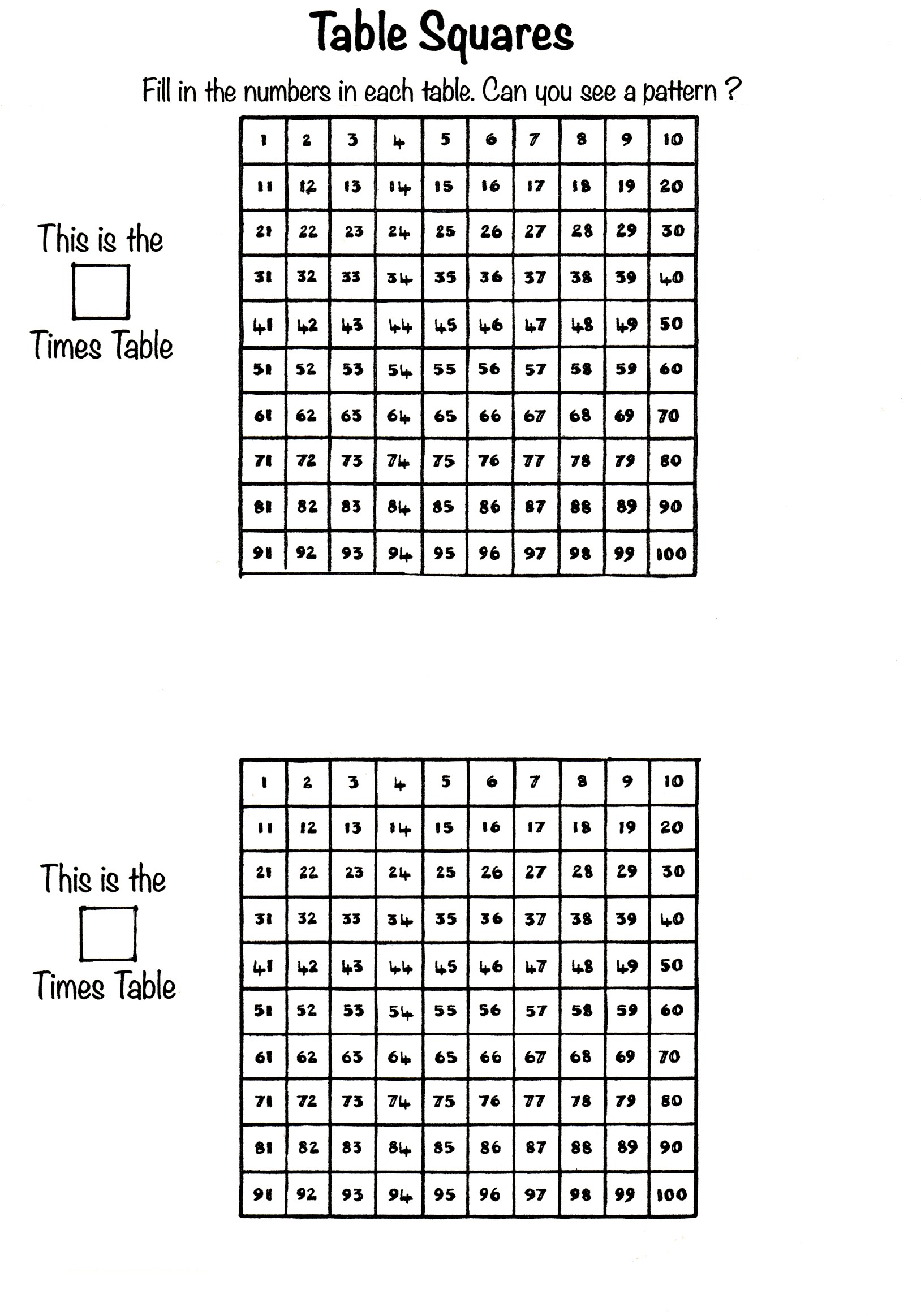 Download the ‘Table Squares’ sheet here. Cut out one of the table squares and ask the pupil to circle the relevant table numbers in order to observe a visual pattern.